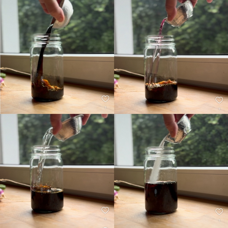 - In dieses gibt man Wasser, Sojasauce, Essig und Zucker, verschließt es und schüttelt es so lange, bis der Zucker sich komplett aufgelöst hat.