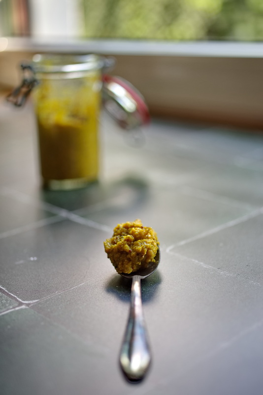 - Die beiden Relish-Bestandteile in einem kleinen Multihacker oder Mixer oder dem Pürierstab fein pürieren. Dann mit dem Senfmehl und den verschiedenen Senfsaaten vermengen und in eine sterilisiertes Glas geben. Verschliessen.